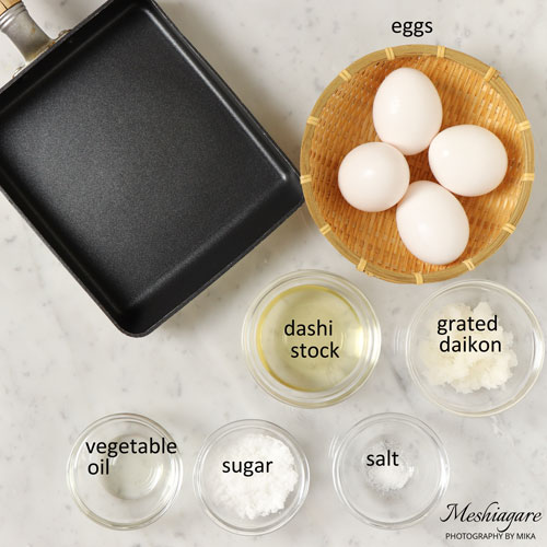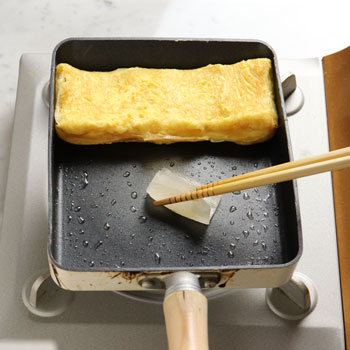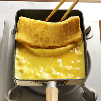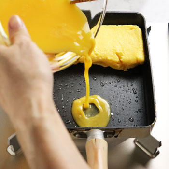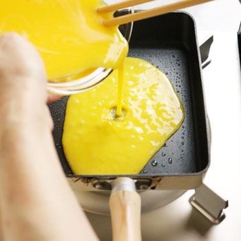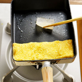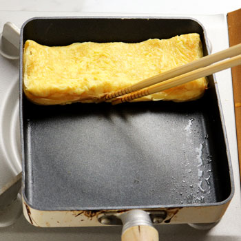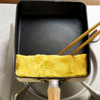 • You can use any rimmed style frying pan to make dashi maki tamago. The shape of the pan is not important, whats important is the flavor.
