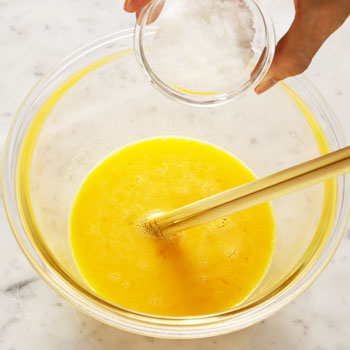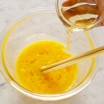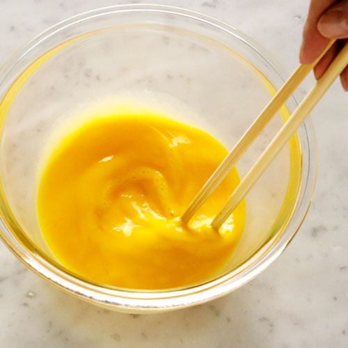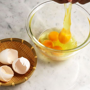 • Crack the eggs in a bowl and beat them. Don’t beat them too strongly. Try not to create air bubbles to make this omelet.