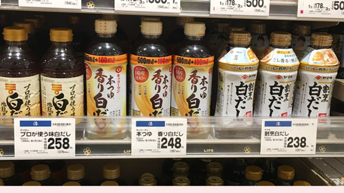 I asked my friends and colleagues what flavored rolled eggs they usually make, then I found the current trend. Many friends add all-purpose seasoning called 白だし (shiro-dashi) to their eggs. Shiro-dashi means white dashi. It contains katsuo dashi, konbu dashi, white soy sauce, etc. Although I hardly use this kind of seasoning, I know it really tastes good because my daughter uses this seasoning. Just adding shiro-dashi, you can make an authentic taste. Also, it doesn’t color your food, so this is an easy and smart way to preserve the beautiful color of your ingredients. You can see many different brands of shiro-dashi at supermarkets in Japan. Now, shiro-dashi is becoming available overseas.