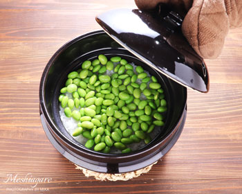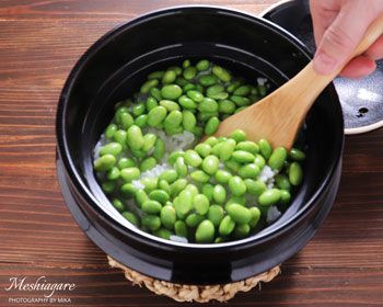 Of course, you can cook this dish with your rice cooker. When you use an electric rice cooker, don’t use the keep-warm function. Otherwise, the brilliant green of edamame will turn to a beige color.