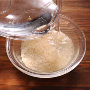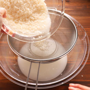 - Drain the cloudy water using a small mesh strainer. In the first step, the dried rice rapidly absorbs water, so make sure you do this quickly to wash off the dust. It’s also an effective way to remove the bran from the rice.