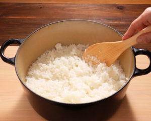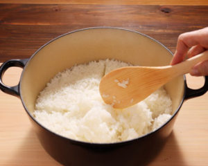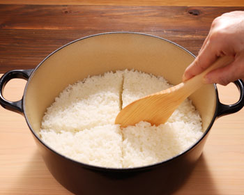 - Rotate each part of the rice in a circular motion, be careful not to mash your rice while moving it from the bottom to the top to help release the steam using a "Shamoji" rice paddle.