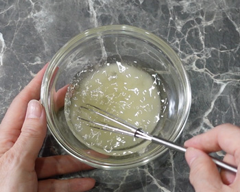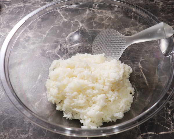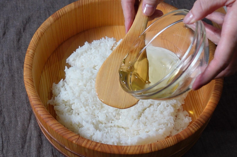 Once the rice is cooked, add sushi-zu “vinegar mixture”, and stir the rice with a cutting motion. This process is very important to prevent the rice from becoming too sticky.