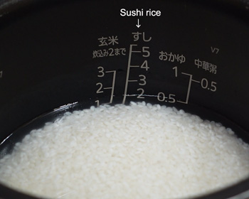 Almost every rice cooker sold in Japan comes with the proper water lines to guide you for different rice styles. Even if you don’t have a cooker like mine, you can still make the sushi rice with the same amount of water.