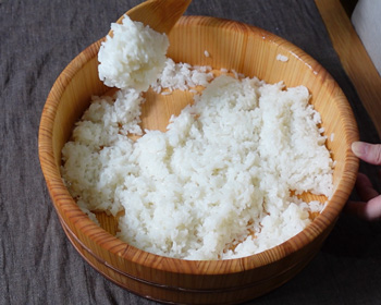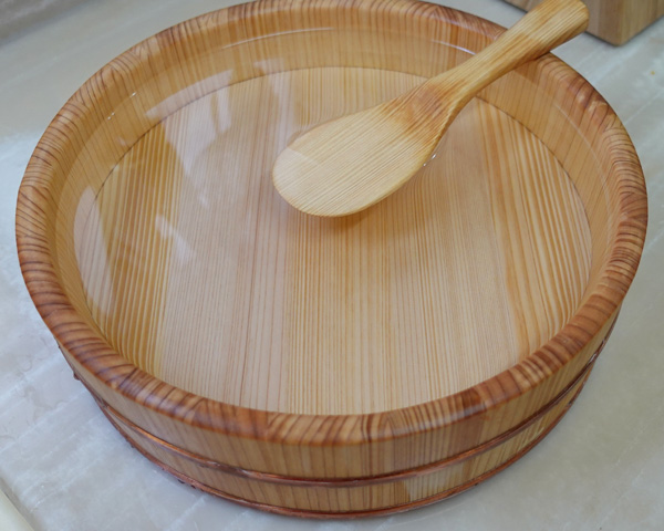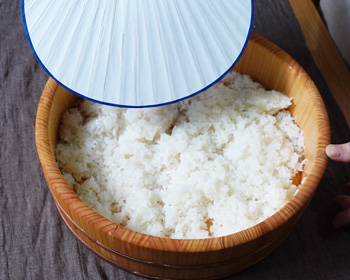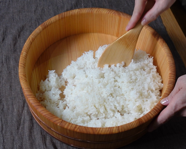 I can’t say every household has a sushi tub but you can easily find it here in Japan. If you have this tub, moisten it beforehand by filling it with tepid water to prevent the rice from sticking to it.