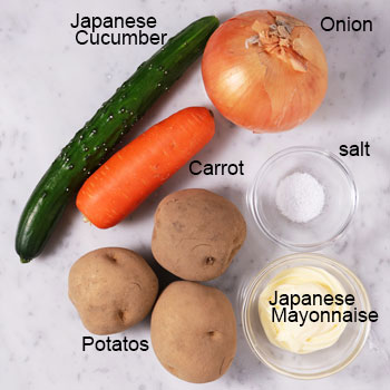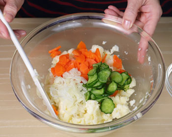 This time, I added very basic ingredients, cucumbers, carrots, and onions to this potato salad but you can add other ingredients as you like. In Japan, ham, lettuce, boiled eggs are often used for this.