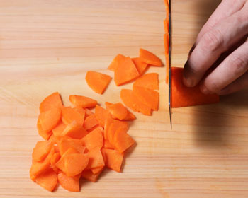 • Cut the carrots into quarters length-ways. Slice them sideways. Place the carrots in the steamer next to the potatoes.