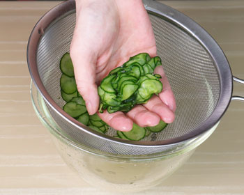 Put the cucumbers in a bowl and add about a 1/3 of a teaspoon of salt. Massage the cucumbers gently and put them aside for about 5 minutes.