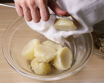• As soon as the potatoes are cooked, hold the potato with a kitchen cloth and remove the skin with a table knife. Since we cut the potato into halves, it should be easy to remove the skin.