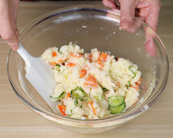 Another characteristic of this potato salad is its rough texture. Try not to mash your potatoes too much. Japanese potato salad has some small chunks here and there.