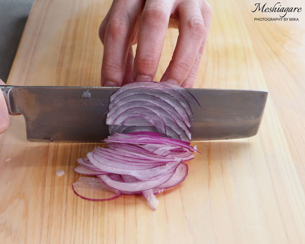 I’m going to introduce a simple salad. I often make daikon salads but the ingredients except daikon radish are various depending on my mood. Today I added red onion, broccoli sprouts, and cherry tomatoes to make my salad look better. However, they are completely optional. So basically, all you need is daikon radish.