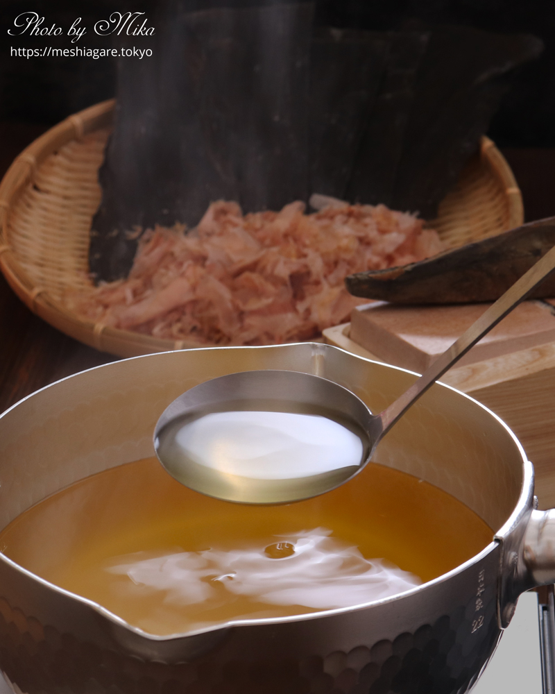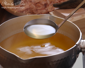 The “kombu and katsuo Ichiban dashi” is extremely flavorful and aromatic. The harmony between inosinic acid that comes out of katsuobushi and glutamic acid that comes out of kombu makes the ultimate umami flavor.