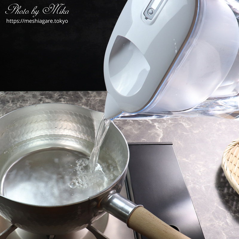 Water is one of the key ingredients for dashi. Please make sure you use soft water when bringing out the umami of natural ingredients. A lot of minerals in hard water seal the surface of the ingredients and hold the umami on the inside. It’s good for stewing meat and poultry. On the other hand, soft water doesn’t contain abundant minerals and allows us to bring out the umami of the ingredients. We have softwater in Japan, so I can use tap water for making dashi. However, I always use filtered water for it. The difference between them is obvious to me. That’s why I think water is also one of the ingredients.