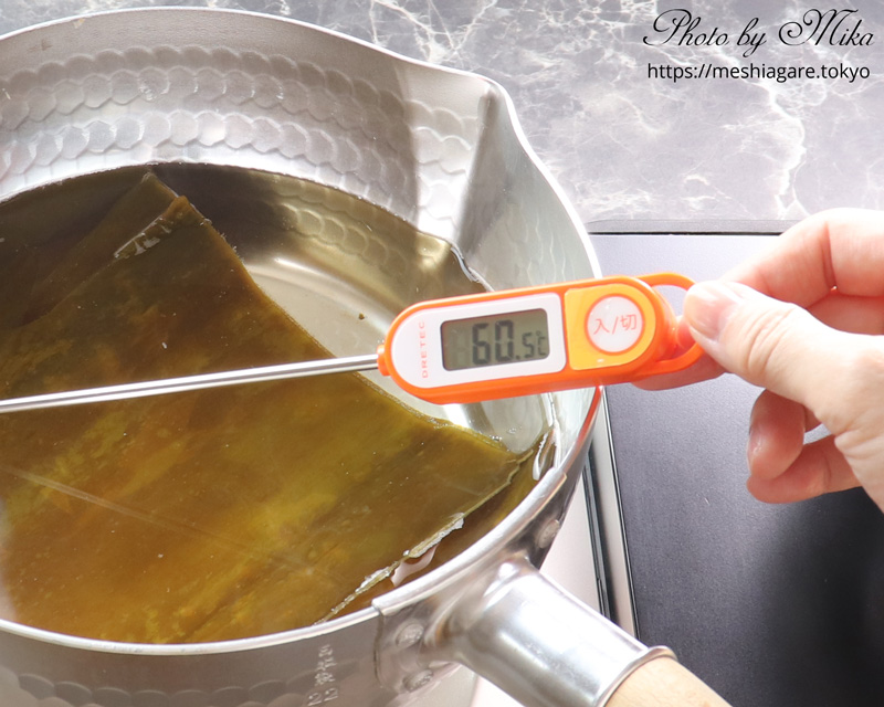 Please take a closer look at the kombu in the pot. Can you see the small bubbles at the edges of the kombu? That is the perfect timing to remove the kombu from the pot. If you cook the kombu too much, some unwanted flavors come out. The temperature is approximately 60℃ (140℉).