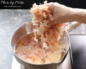 Next, when you can see the small bubbles on the bottom of the pot, it’s the perfect timing for adding katsuobushi flakes. The temperature is approximately 85℃ (185℉).