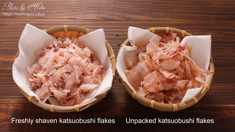 Also, as you can see, the color of katsuobushi flakes are different between freshly shaven flakes and pre-packed products. Dried katsuo starts to oxidize as soon as it’s shaven, and turns a brownish color.