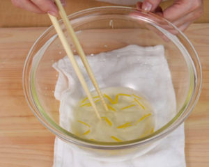 - In another bowl, combine the sugar, vinegar and yuzu skin.