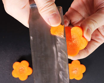 - Cut the carrot into 1 cm slices. Make the Plum blossoms if you like. See how to make...