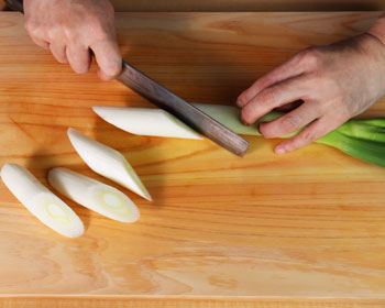 - Slice the white part of the long onions diagonally.