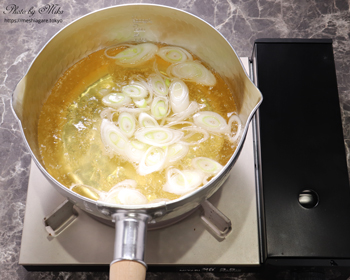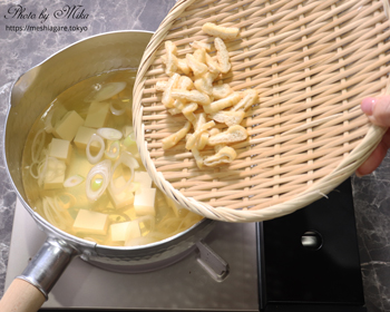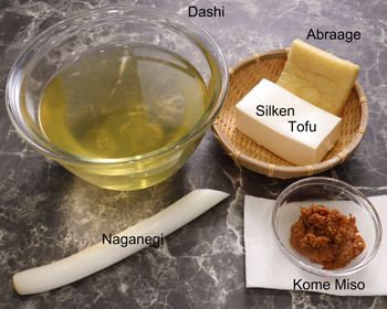 Solid ingredients in this soup are tofu, aburaage and naga-negi. Those are often used for miso soup together or individually, and go well with almost any type of dashi and miso.