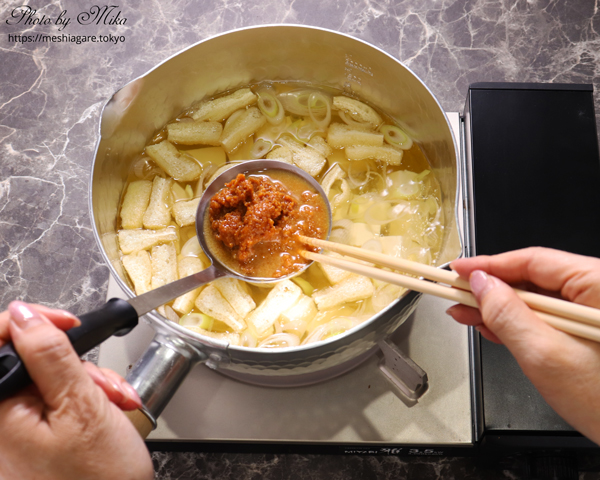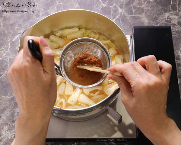 Even if you don’t have the strainer, don’t worry about it. You can dissolve miso little by little in a ladle or a bowl with chopsticks.