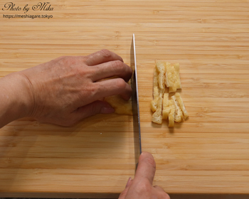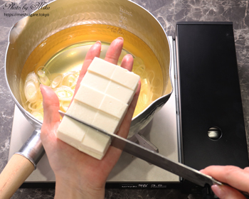 However, if you are worried about cutting yourself, you don’t need to follow my way of preparation. It’s not a big problem if your tofu crumbles a little bit. You can also use cotton tofu. It’s easier to cut on a cutting board and you can enjoy a thick taste and firm texture.