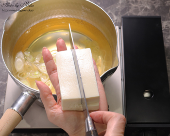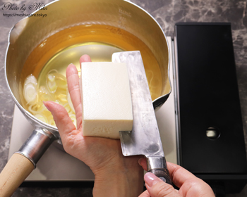However, if you are worried about cutting yourself, you don’t need to follow my way of preparation. It’s not a big problem if your tofu crumbles a little bit. You can also use cotton tofu. It’s easier to cut on a cutting board and you can enjoy a thick taste and firm texture.